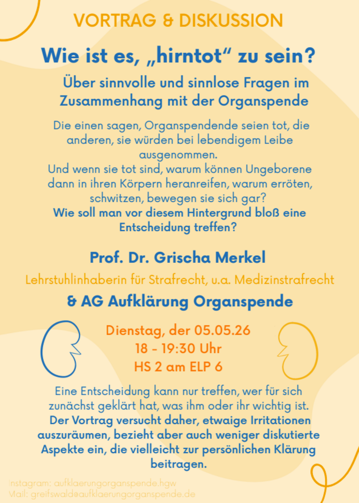 Die einen sagen, Organspendende seien tot, die anderen, sie würden bei lebendigem Leibe ausgenommen. Und wenn sie tot sind, warum können Ungeborene dann in ihren Körpern heranreifen, warum erröten, schwitzen, bewegen sie sich gar? Wie soll man vor diesem Hintergrund bloß eine Entscheidung treffen? Eine Entscheidung kann nur treffen, wer für sich zunächst geklärt hat, was ihm oder ihr wichtig ist. Der Vortrag versucht daher, etwaige Irritationen auszuräumen, bezieht aber auch weniger diskutierte Aspekte ein, die vielleicht zur persönlichen Klärung beitragen.