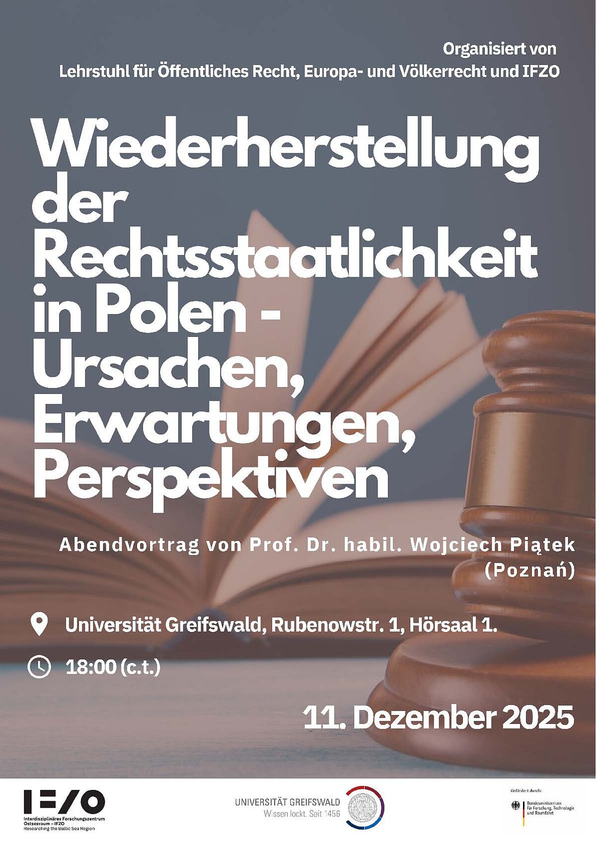 Am 11.12.2025 um 18.15 findet der Abendvortrag “Wiederherstellung der Rechtsstaatlichkeit in Polen - Ursachen, Erwartungen, Perspektiven” von Prof. Dr. habil. Wojciech Piątek, Adam-Mickiewicz-Universität in Posen, statt.
