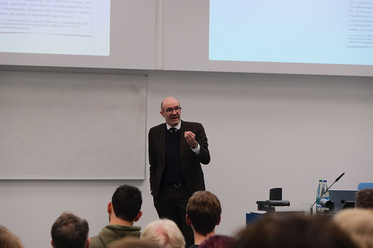 Was machte das Verfassungsrecht der DDR aus? Wie hat es sich im Laufe der Zeit verändert? Und welche Rolle spielte die Verfassung im Alltag von Staat und Gesellschaft der DDR? Diesen und weiteren Fragen widmete sich der Referent Prof. Dr. Frank Schorkopf von der Universität Göttingen, Inhaber des Lehrstuhls für Öffentliches Recht und Europarecht.