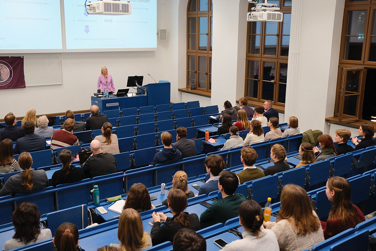 Zunächst referierte Frau Christine Busse, Generalstaatsanwältin des Landes Mecklenburg-Vorpommern, über die dogmatischen Grundlagen des Legalitätsprinzips als eine der relevantesten Prozessmaximen des deutschen Strafprozessrechts. Im Anschluss diskutierten die Teilnehmenden mit der Referentin über die Einflussfaktoren auf die Objektivität der Staatsanwaltschaft, die Kriminalitätsentwicklung in unserem Bundesland, die gesunkenen Noten-Anforderungen an zukünftige Bewerbende sowie die Attraktivität des staatsanwaltlichen Berufs, der auch Entscheidungsfreudigkeit voraussetze. Handlungsbedarf bestehe – so Busse – aufgrund entstehender Personalengpässe, da nach gegenwärtigen Analysen jeder der rund 170 Staatsanwältinnen und Staatsanwälte in MV ca. 30 % Mehrarbeit übernehmen müsse im Vergleich zu einem vollbesetzten Personalkörper.