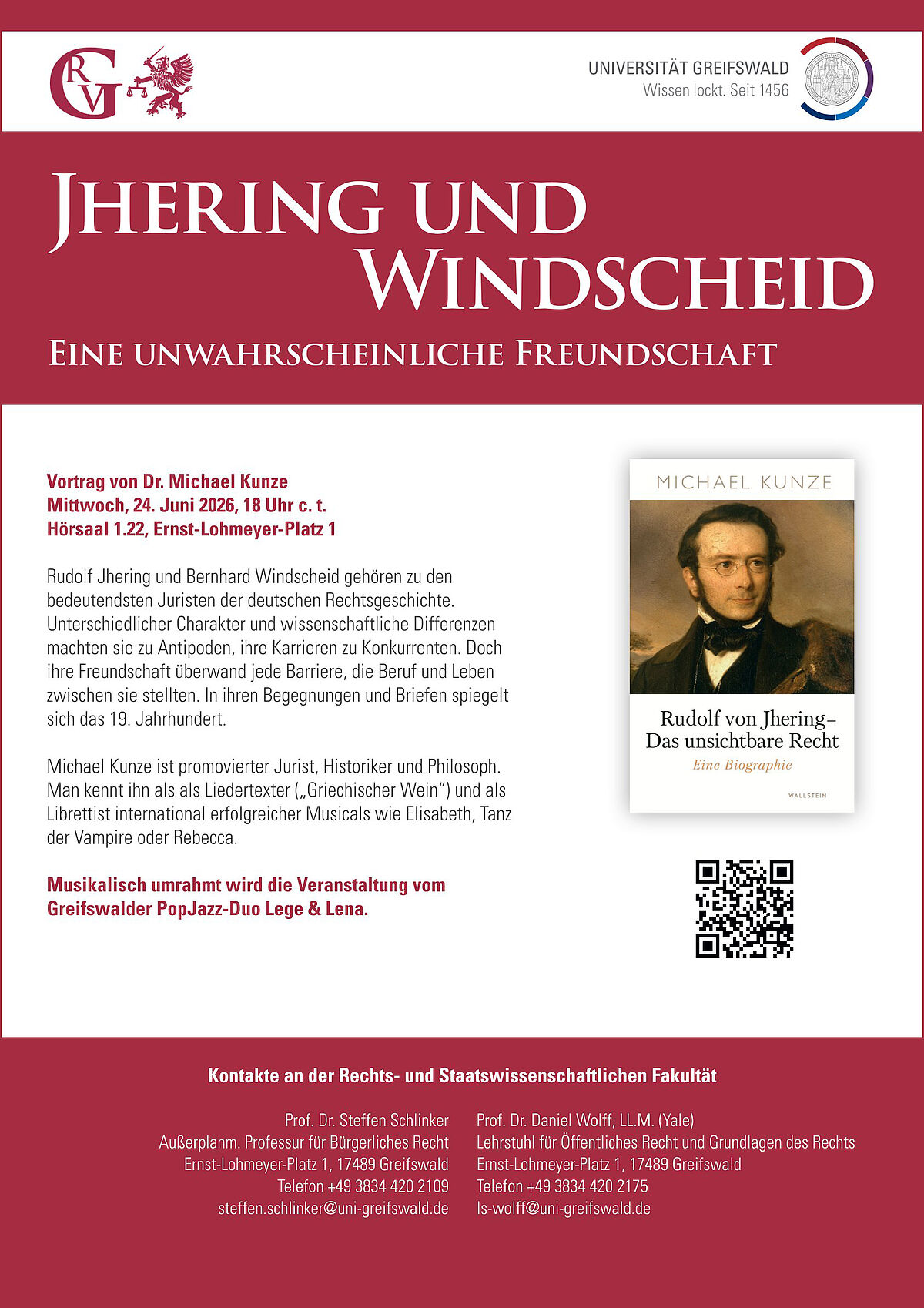 Ein Weltstar gastiert in Greifswald. Die Rechts- und Staatswissenschaftliche Fakultät der Universität Greifswald begrüßt am 24. Juni einen weltbekannten Musiker, Schriftsteller und Juristen: Michael Kunze. Er wird einen Vortrag halten über die Freundschaft des damals ebenfalls weltbekannten Rechtsprofessors Rudolf von Jhering mit seinem kaum weniger bekannten Greifswalder Kollegen Bernhard Windscheid.
