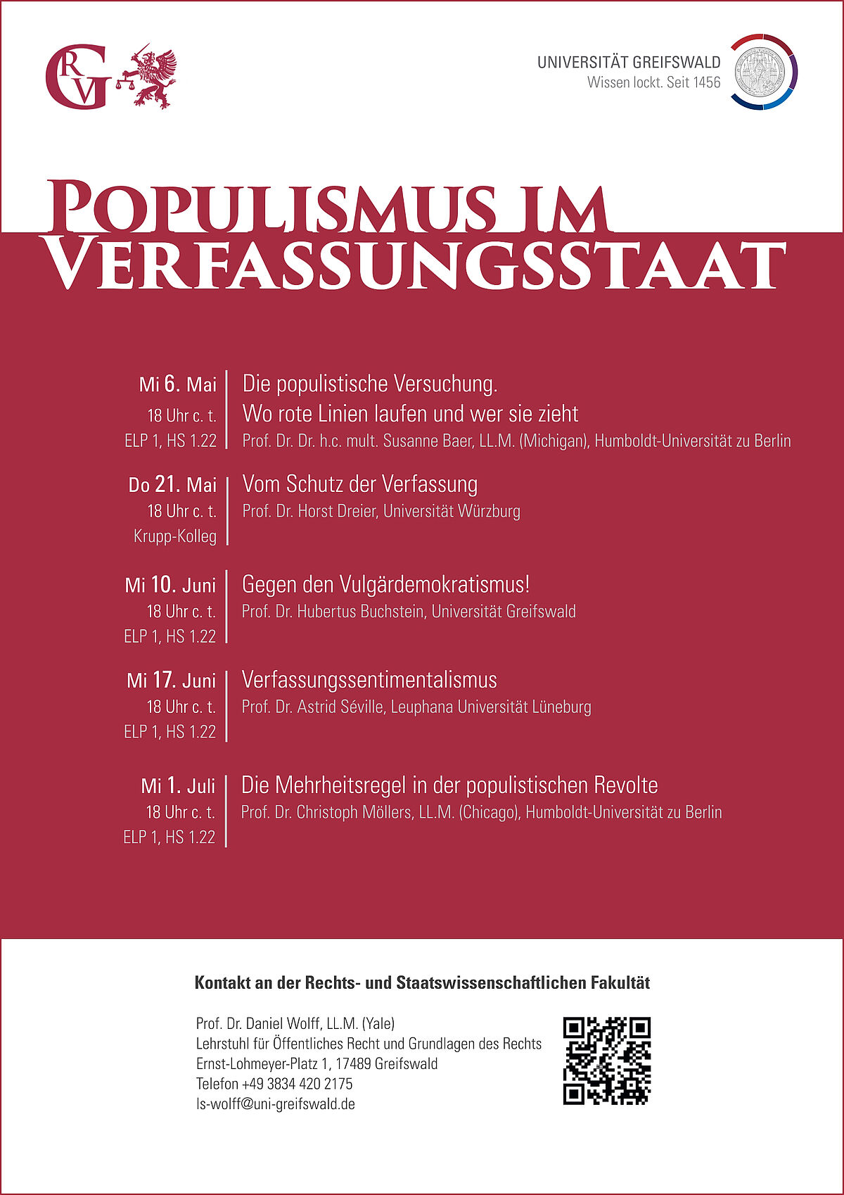 Diese politische Konstellation nehmen die Greifswalder Rechtsvorträge im Sommersemester 2026 zum Anlass, sich aus rechts- und politikwissenschaftlicher Perspektive dem Verhältnis von (Anti-)Populismus und demokratischem Verfassungsstaat zu nähern. Die fünf Vorträge der Reihe versuchen sich in politiktheoretischer Selbstvergewisserung und soziologischer Ursachenforschung, vermessen das Bedrohungspotenzial des Populismus sowie das Resilienzniveau des demokratischen Verfassungsstaats und fragen nach der Rolle und dem Beitrag von Verfassung und Verfassungsgerichtsbarkeit bei der Entstehung und Bekämpfung des Populismus. Schließlich wird die bisherige Strategie im politischen Umgang mit dem autoritären Populismus auf den Prüfstand gestellt und untersucht, wie eine verfassungskonforme Antipopulismuspolitik aussehen kann, die die autoritäre Wende tatsächlich aufhalten kann.